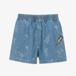White cotton shorts for baby boys, unmistakably by luxury French brand KENZO KIDS with a logo pattern in shades of blue and green. Just right for relaxed days, they are made in stretchy jersey and have a comfortable, elasticated waistband with a bright blue drawstring for a good fit. They have useful, concealed side pockets.