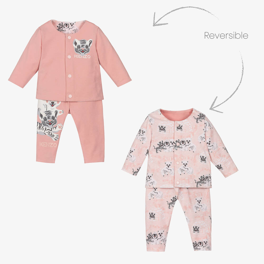 Reversible pink tracksuit for baby girls by KENZO KIDS, made in organic cotton jersey. The top fastens with easy to use poppers on the front, and the bottoms have an elasticated waist for comfort. One side of the items is pink with winter animals printed on the front and down one leg. The other side is pale pink with mini girl jungle print in white and grey.