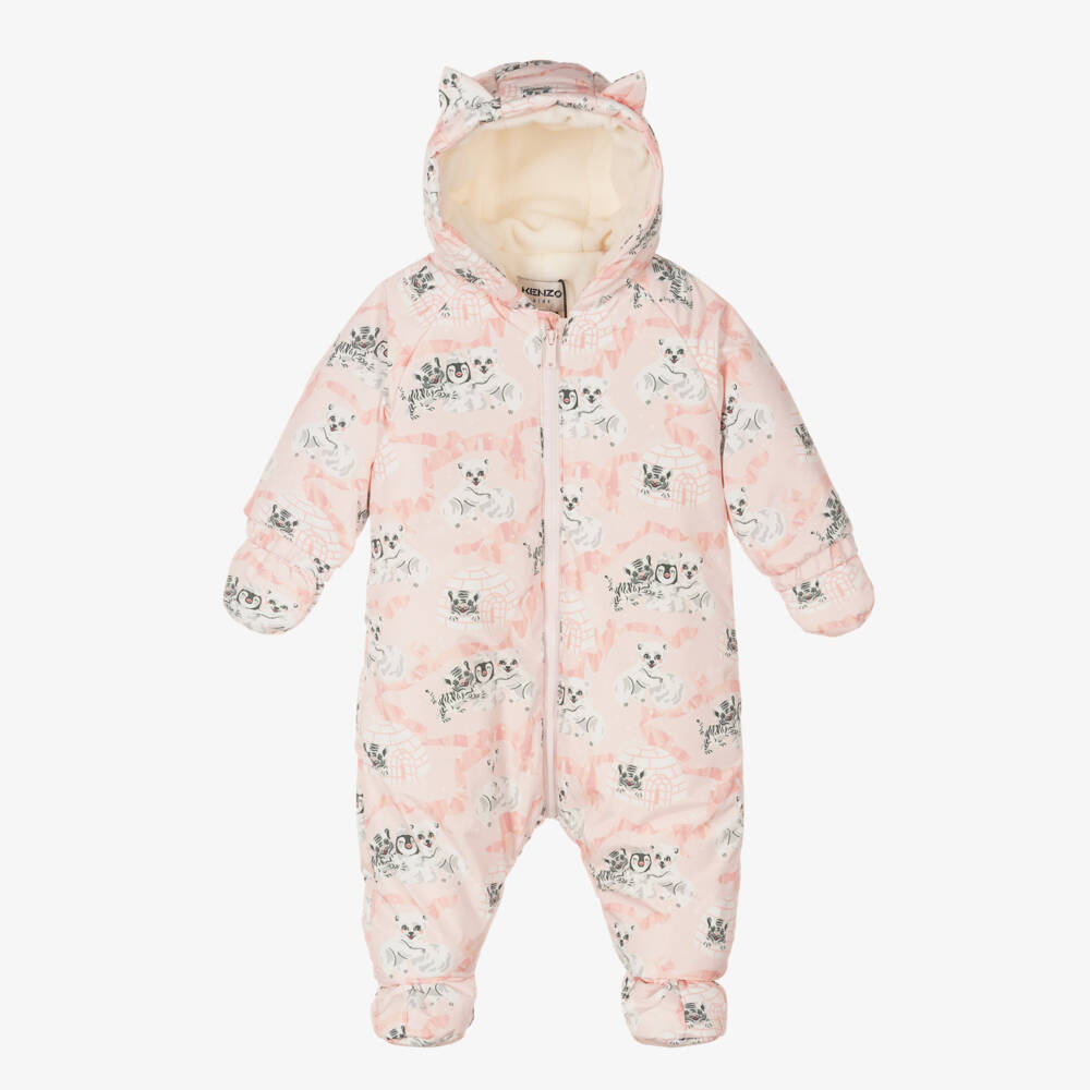 Adorable pale pink water repellent snowsuit for baby girls by KENZO KIDS, with 3D ears on the hood. Soft and silky, warmly padded and with a cosy fleece lining, it has a cute baby animals and igloo logo print. There are detachable mittens and booties secured with poppers for extra cosiness. It fastens with a front zip.