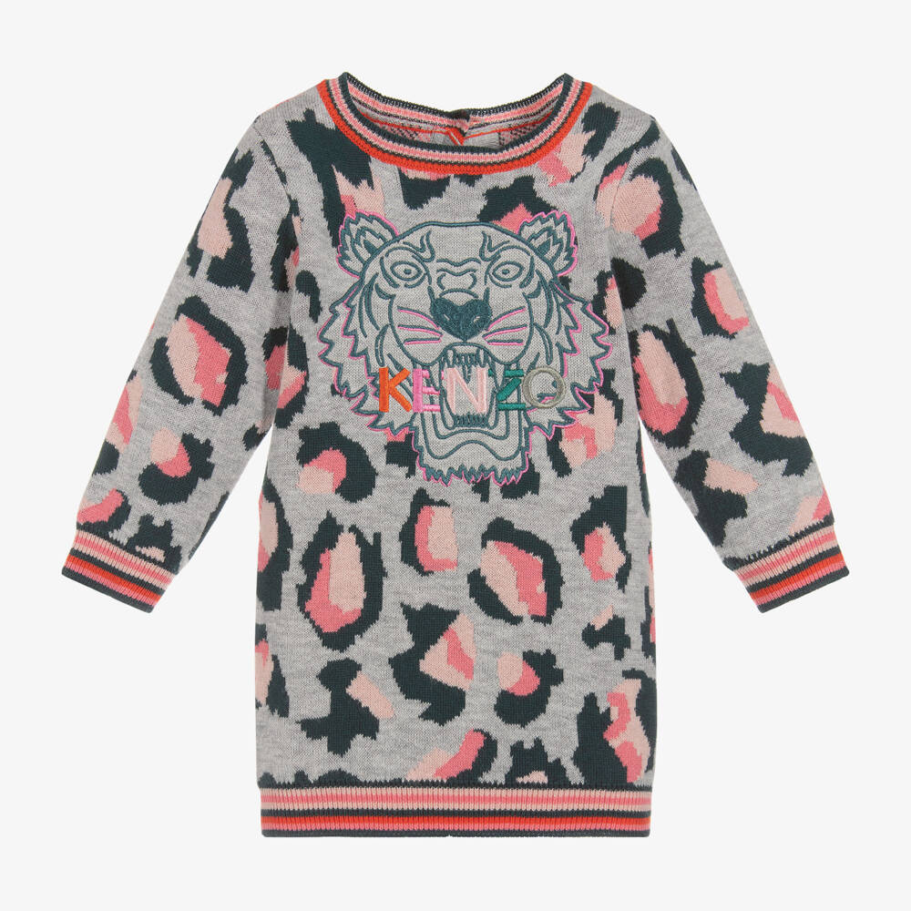 Baby girls grey sweater dress with Kenzo's iconic Tiger embroidery and 'Panther' print in green and pink. Made from a double layer of knitted cotton and viscose, with a touch of wool, it is super soft and stretchy.