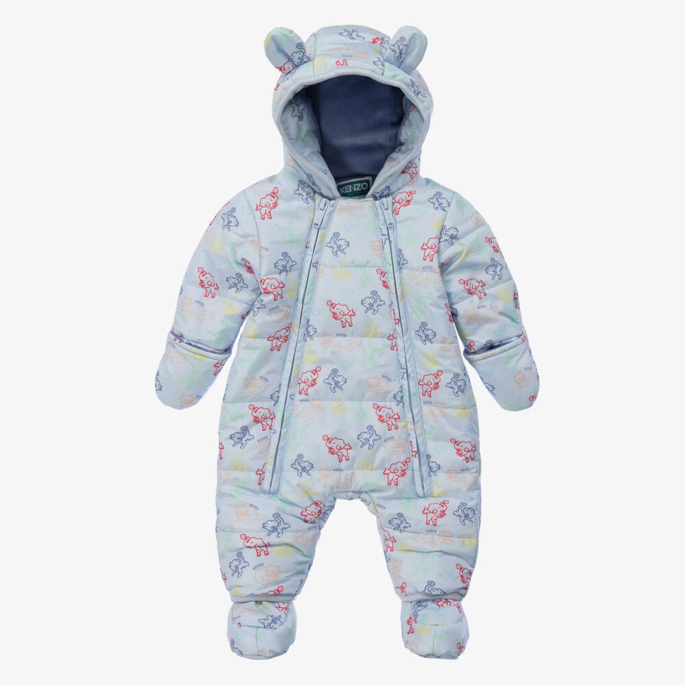 Adorable pale blue, water-repellent snowsuit for baby boys by KENZO KIDS. Soft and silky, it has a double front zip fastening with a storm flap behind, and a large hood with 3D ears for a cute look. It is lightly padded and has a luxuriously soft polar fleece lining for superior comfort. Patterned in a colourful logo elephant and tiger print, it comes with integrated mittens and detachable booties, which secure with poppers, for extra cosiness.