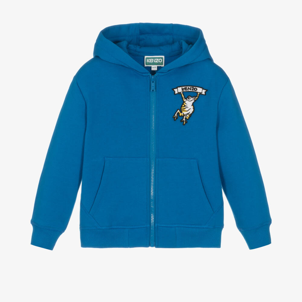 A vibrant cobalt blue zip-up top for boys and girls from KENZO KIDS. The label's fun Frog character holding a logo banner can be found on the chest in the form of an embroidered patch. With a fleecy-feel underside for added cosiness, it is made in cotton-rich jersey that is soft, stretchy and gentle on the skin. Bright yellow and blue embroidered logo lettering on the back complements the colour palette. It has fleece-lined front pockets to keep little hands warm and a branded front zip for quick dressing.