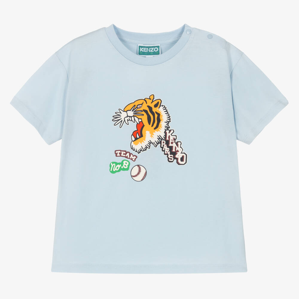 A pale blue T-shirt for little boys by luxury French brand KENZO KIDS, made in the softest organic cotton jersey. This top has the iconic varsity Tiger logo printed on the front for a cool, sporty look. There are popper fastenings on one shoulder.
