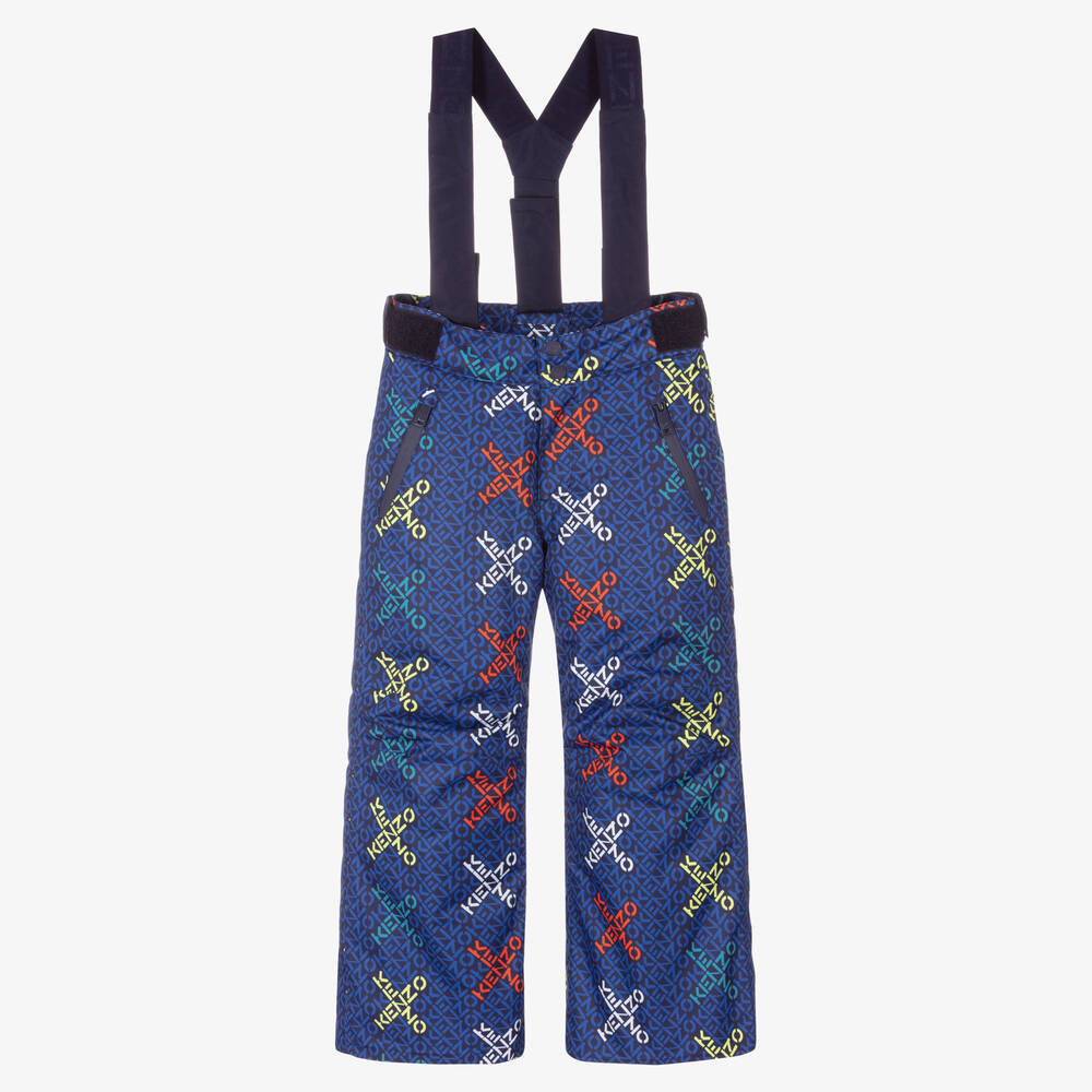 Blue ski salopettes for boys by KENZO KIDS, made in smooth nylon. They have a Small X logo print in shades of orange, red and green and are lined in warm polar fleece and have detachable shoulder straps. They fasten with front poppers and zips, with adjustable velcro tabs on the waistband to ensure a good fit. There are inner gaiters to keep out the snow.