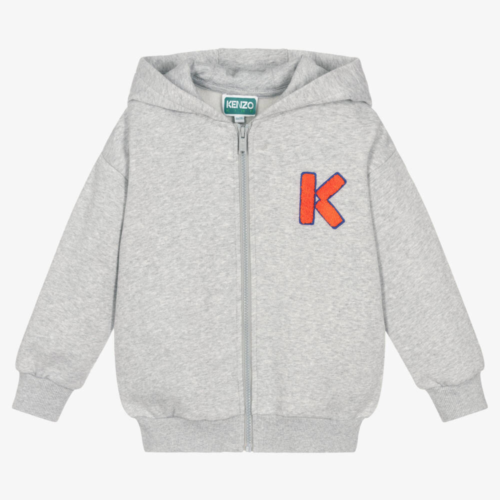 A grey marl zip-up hoodie for boys by KENZO KIDS, made from super soft cotton jersey. The signature orange-red K motif is featured in a soft bouclé, with bold royal blue embroidered trims. This casual top is finished with a circular Kenzo Paris logo on the back.
