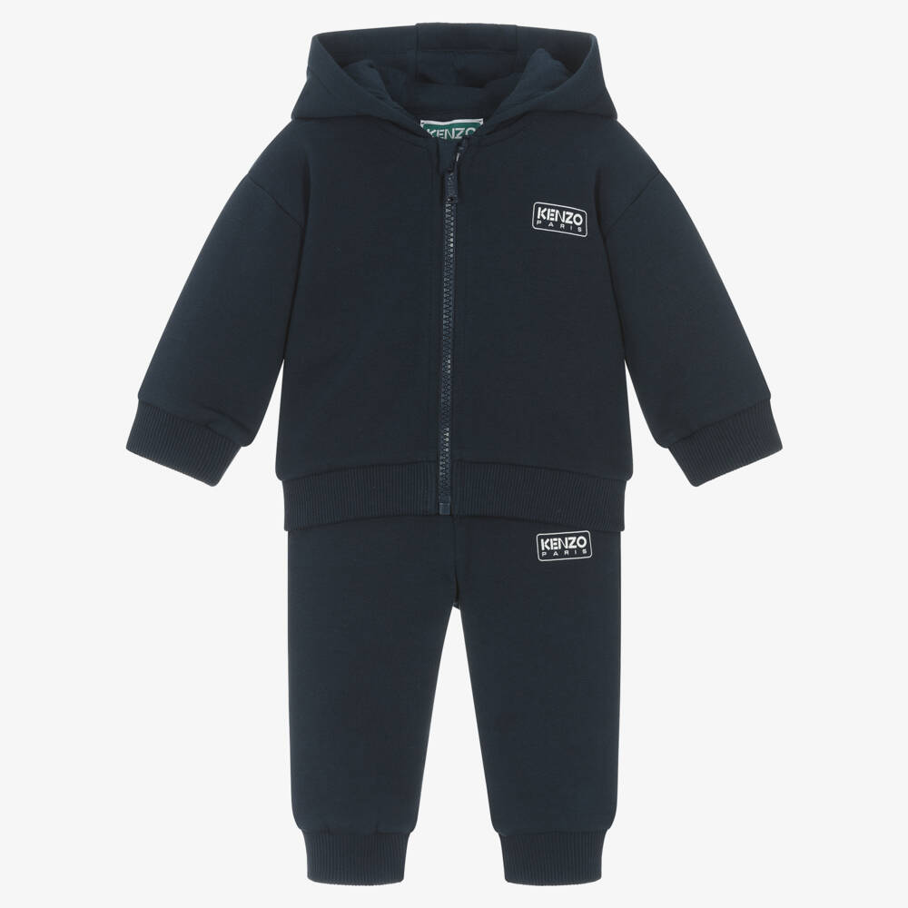 A navy blue tracksuit for younger boys from KENZO KIDS, made in soft, mid-weight cotton jersey. The hooded long-sleeved zip-up top has a large Kenzo Paris logo on the back in white, with a smaller print on the front. Completing the casual look, the cuffed joggers have a matching logo, concealed side seam pockets, and a drawstring elasticated waistband for a comfortable fit.