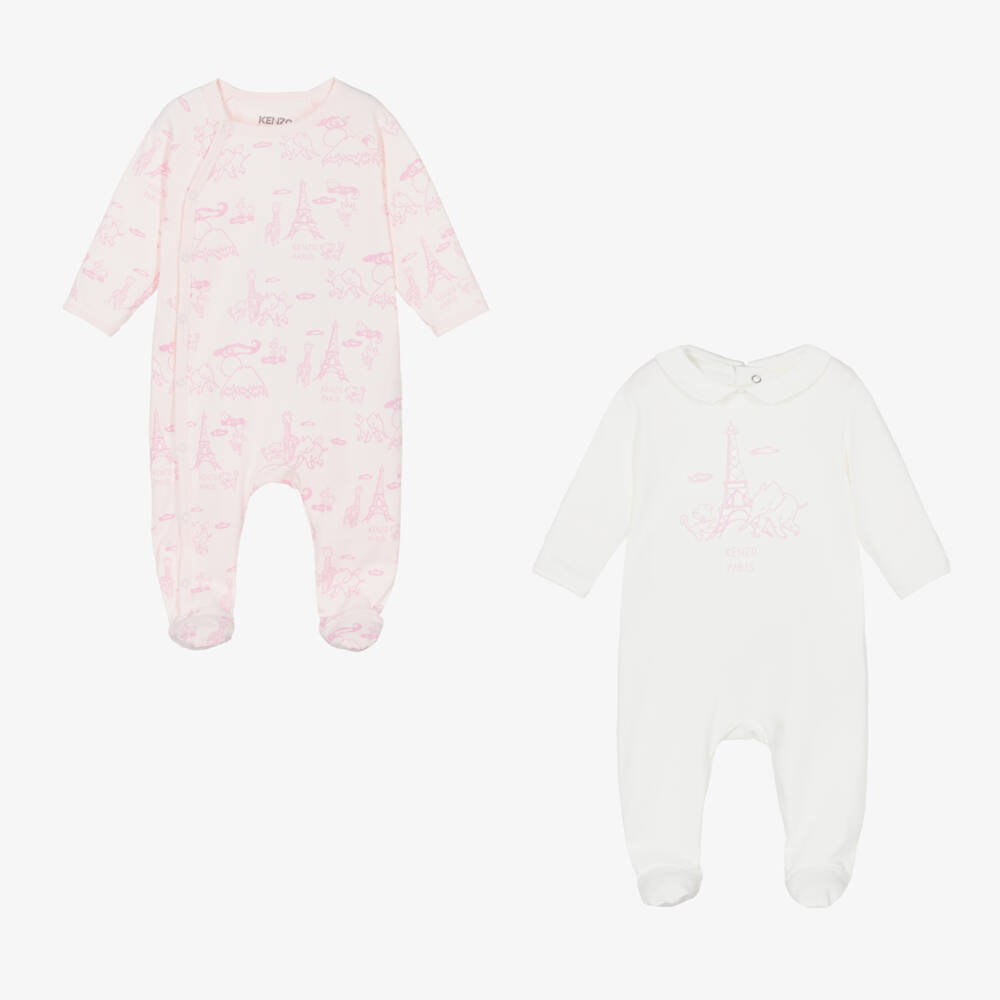 Pack of two organic cotton babygrows for girls, unmistakably by luxury French designer KENZO KIDS, in pale pink and ivory, with the brand's multi-iconics baby animals print. Made in comfortable jersey, the pink babygrow has useful front poppers along one side, whilst the ivory babygrow has a collar, with poppers down and across the back.