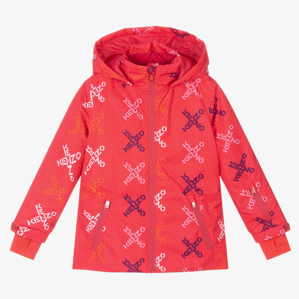 Girls fuchsia pink ski jacket by KENZO KIDS, made in smooth polyester. Lightly padded, it has a tone-on-tone all-over logo print, with a pink, blue and white Cross logo print on top. It has a funnel neck, a front zip with a chin guard, zipped hand pockets and a fixed hood. There are inner jersey cuffs with thumb holes for cosiness, a velcro cuff strap for a snug fit to keep the cold out and a zipped ski pass pocket on one sleeve. Inside there is a cosy, fleecy lining and a snow skirt for extra warmth and protection against the elements.