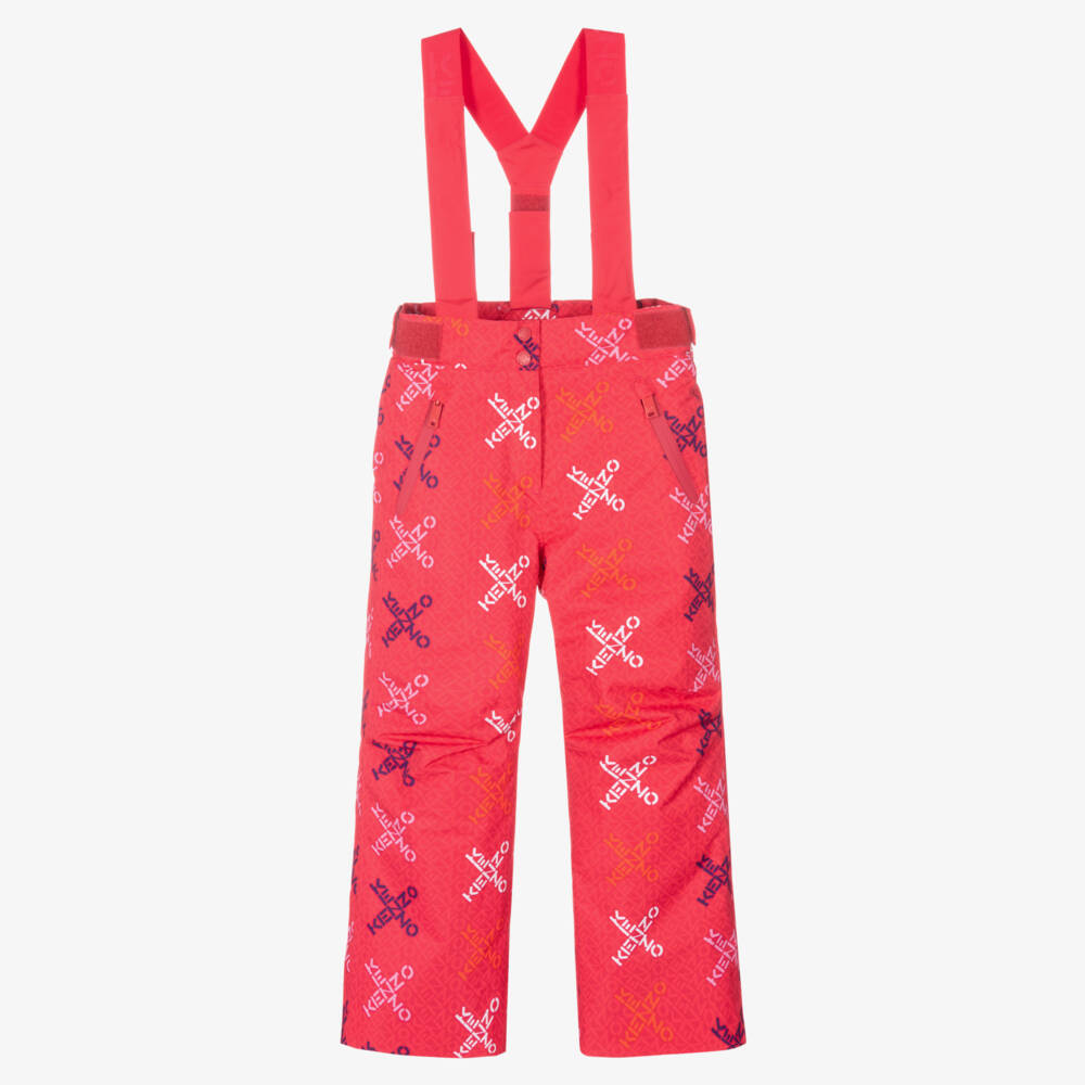 Girls fuchsia pink salopettes by KENZO KIDS, made in smooth polyester. They have a tone-on-tone all-over logo print, with a pink, blue and white Cross logo print on top. Warmly padded, they have removable and adjustable logo shoulder straps that fasten with velcro and an adjustable waistband for a good fit. They fasten on the front with logo poppers and a zip, with zipped front pockets. Lined in cosy fleece, the legs have internal, elasticated snow gaiters for extra warmth.