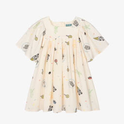 Fun cotton dress for girls by KENZO KIDS, with a colourful fruit stickers and logo print, including the brand's iconic Elephant. It is made in soft jersey with a frilled hemline and is easy to wear, simply pulling on.