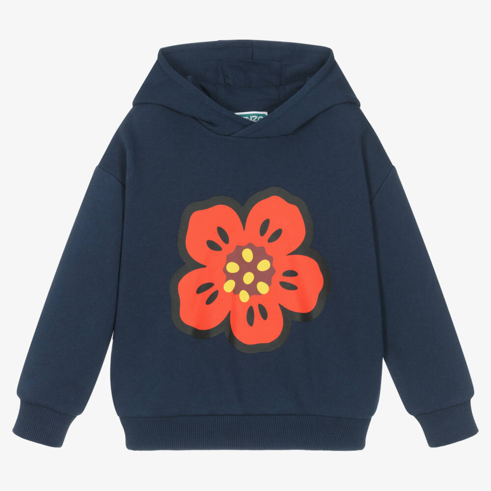Navy blue hoodie for boys and girls from KENZO KIDS, made in soft and comfortable mid-weight cotton jersey with stretchy ribbed trims. Great for casual wear, it has the brand's signature Boke Flower printed boldly on the front. To complete the designer look, a Kenzo Paris logo is printed on the back in white.
