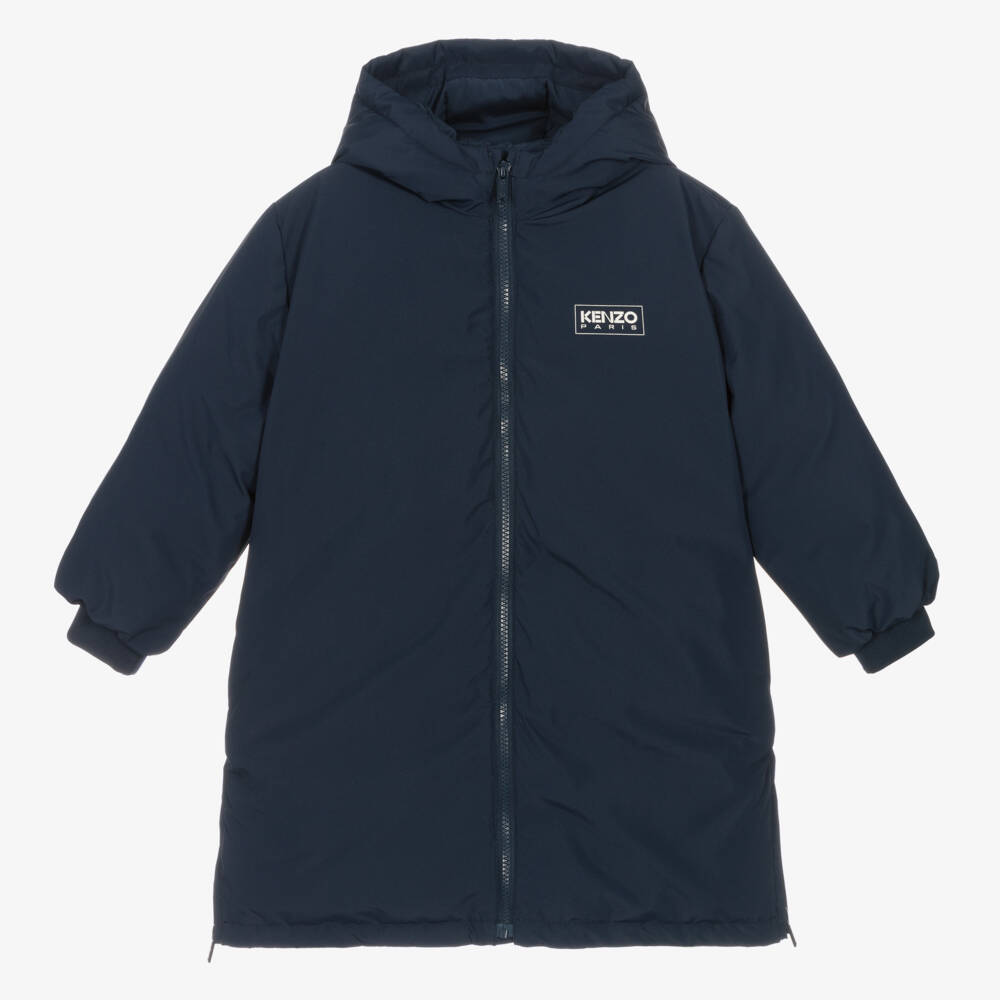 Navy blue hooded puffer coat for boys and girls from KENZO KIDS, with the French designer's white Kenzo Paris logo printed in white on the front and back. Down padded for luxurious warmth, it is made in silky smooth water-repellent fabric with a satin lining and has cosy ribbed cuffs. There is a branded front zip fastening, additional side zips to allow for easy movement and useful concealed side pockets.