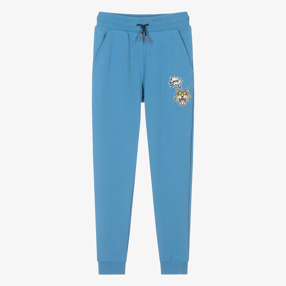 Mid-blue cotton joggers for teen boys from KENZO KIDS, with side pockets. Known for their use of playful animal designs, the French fashion house has styled these cuffed joggers with an embroidered tiger and comic book-style exclamation motif. A yellow varsity-style Kenzo Paris logo can be found on the back pocket to add extra designer appeal. Made from mid-weight jersey, they have useful front pockets and a stretchy, ribbed waistband with drawstring ties.