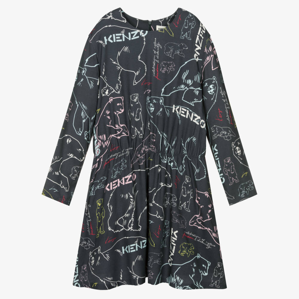 Inspired by the brand's iconic logos, charcoal grey dress for teen girls by KENZO KIDS. Elasticated at the waist for a feminine silhouette, it features the brand's most famous emblems printed in stylish pastel colours. Fastening with a concealed zip on the back for a chic finish, it is made in soft viscose twill and has a black voile lining, adding comfort to this stylish look.