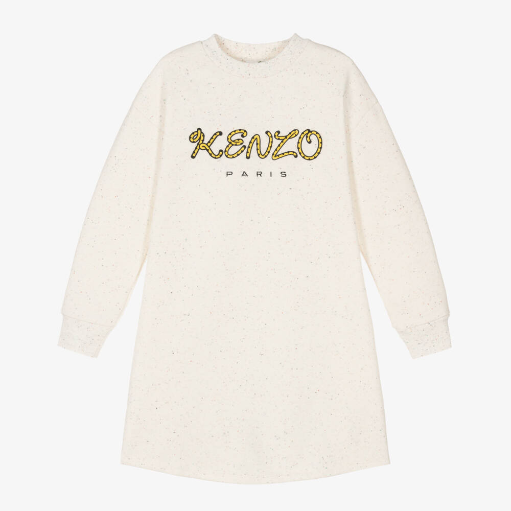 Casual ivory sweatshirt dress for teen girls by KENZO KIDS, flecked with a colourful marl effect. For instant designer appeal, the French brand's yellow and black Tiger Tail logo is embroidered on the front. The dress is made in cotton-blend jersey with a cosy fleece feel inside, soft ribbed trims and a stylish A-line shape.