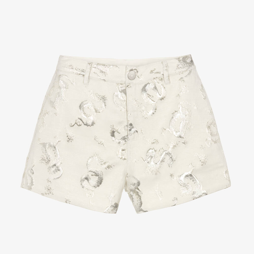 Teen girls will get noticed in these fabulous ivory shorts by French luxury designer KENZO KIDS, glittering with silver jacquard dragons and logos. Ideal for celebrating the Lunar New Year, they are part of the brand's dedicated capsule but could also be worn to elevate any everyday outfit. They have useful side seam pockets and an adjustable waistband for just the right fit. Made in a soft cotton blend and fully lined for comfort, they fasten with a silver logo popper and a zip on the front.