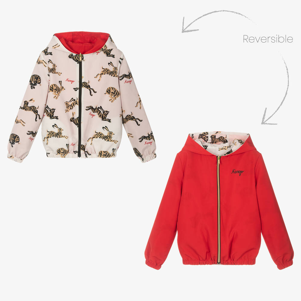Reversible ivory windbreaker jacket for teen boys and girls by KENZO KIDS, patterned with a beige and black rabbit signature design. The plain red side has a small logo printed on the chest for a contrasting look. Lightweight and silky smooth, this casual jacket is elasticated around the cuffs and waist for a good fit. There is an exposed gold zip fastening on the front and useful side seam pockets.