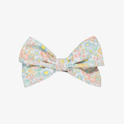 Classic beige marl bow hair clip for girls handmade by French brand Kidiwi. It has lovely pink floral embroidery on the central knot and easily attaches to the hair with a silver metal clip fastening.