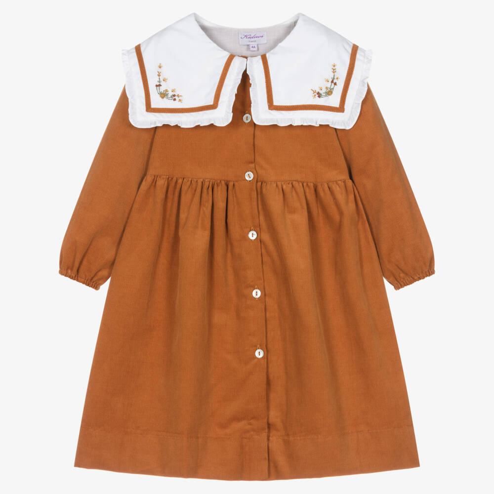 A beautiful tan brown cotton dress for girls by Kidiwi, handmade from soft, cosy needlecord. Traditionally styled, this long-sleeved dress has a large white square collar with sweet floral embroidery and a frill trim. Fully lined, there are discreet side seam pockets, mother-of-pearl front button fastenings, and gently elasticated cuffs for extra comfort.