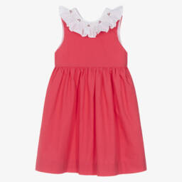From traditional French brand Kidiwi, a handmade cotton dress for girls with a pretty pink gingham check pattern. This sleeveless design has a beautifully hand-smocked panel on the front, detailed with delicate floral embroidery. It has a layered ruffle collar and trim on the back and a full, gathered skirt. Fully lined in lightweight voile for comfort, it fastens with buttons and a sash that ties into a lovely bow.