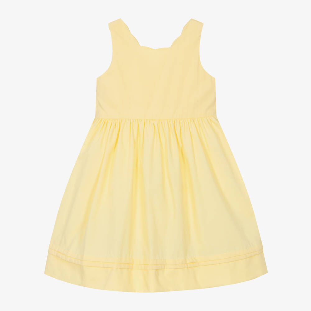 A charming yellow dress for girls by French brand Kidiwi, beautifully handmade in smooth cotton poplin. This sleeveless style has an elegant scalloped neckline and a pretty gathered skirt. The skirt is lined for comfort and added fullness, and has classic pintuck detailing around the hemline. The dress fastens neatly with a concealed zip on the back.