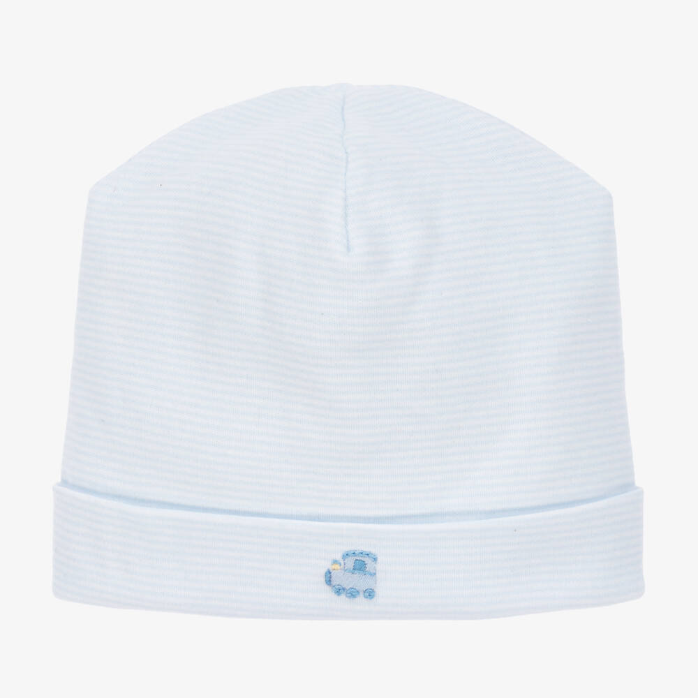 Pale blue and white striped layette hat for baby boys by Kissy Kissy. Made in super soft Pima cotton jersey, it has a cute turned-up brim with a blue, hand-embroidered toy train on the front. It makes a lovely accessory for keeping your baby's little head warm.