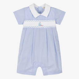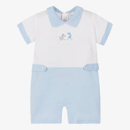 White shortie for baby boys by Kissy Kissy, made in super soft Pima cotton jersey. Patterned with a colourful jungle print, this one-piece has popper fastenings on the front and between the legs for easy dressing. It has a pointed, ribbed collar with sporty stripes for a cute finish.