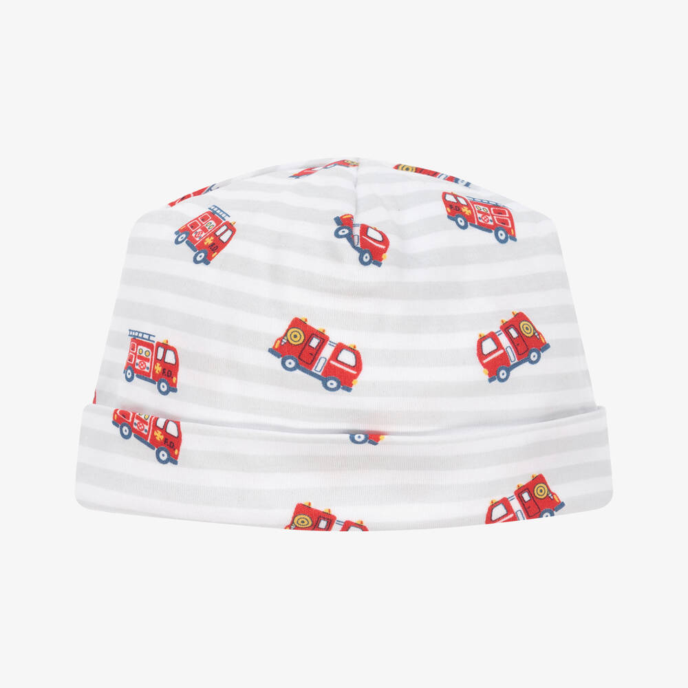 Fun white and grey striped layette hat for baby boys by Kissy Kissy, patterned with playful red fire trucks. Beautifully soft against delicate skin, it easily slips on over your little one's head and has a turned-up brim.