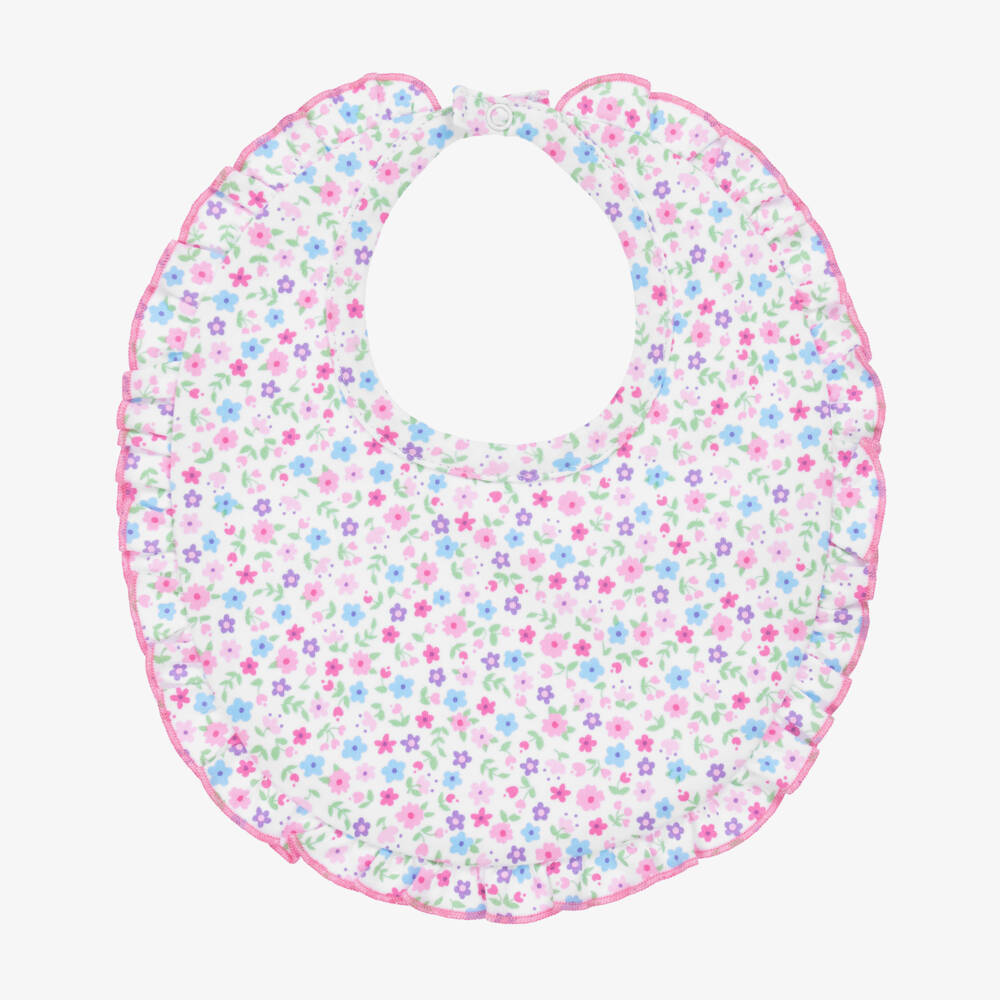 Baby girls white Pima cotton jersey bib by Kissy Kissy, patterned with pretty pink, blue and purple flowers. This sweet bib has a pink ruffled trim around the edge and is secured with a single popper fastening on the neck for a comfortable fit. It has a soft jersey lining on the reverse.