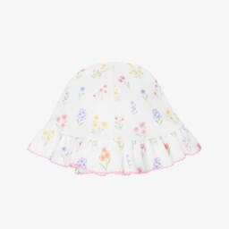 Pretty pink hat for baby girls from Kissy Kissy, made in super soft Pima cotton jersey. It has a sweet tulip pattern in shades of pink and green, and a ruffled brim with a delicate picot trim.