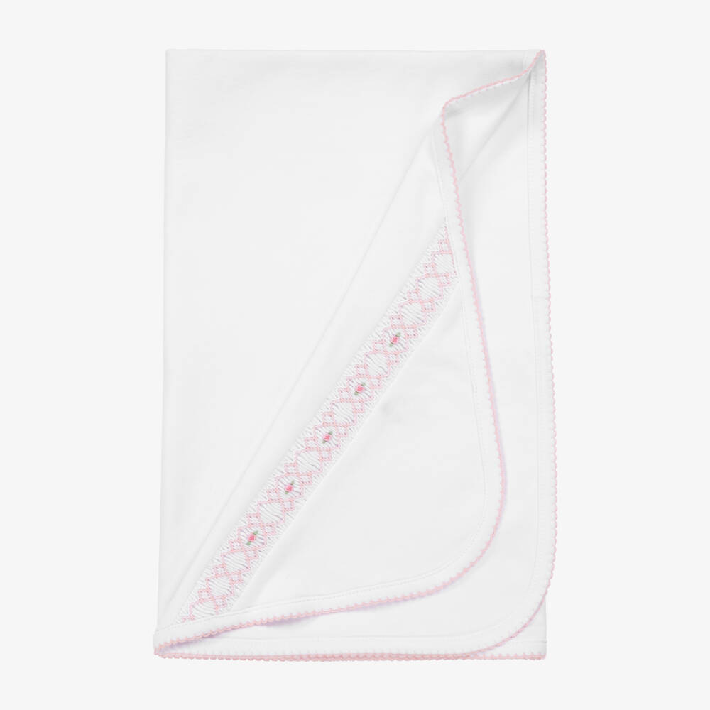 Beautifully soft, white Pima cotton blanket for baby girls by Kissy Kissy. It has pink picot trims and a lovely hand-smocked panel on one corner with embroidered little pink roses and squares. The double jersey layer makes it cosy and versatile as a nursery accessory or to wrap around baby in the pram or car seat.