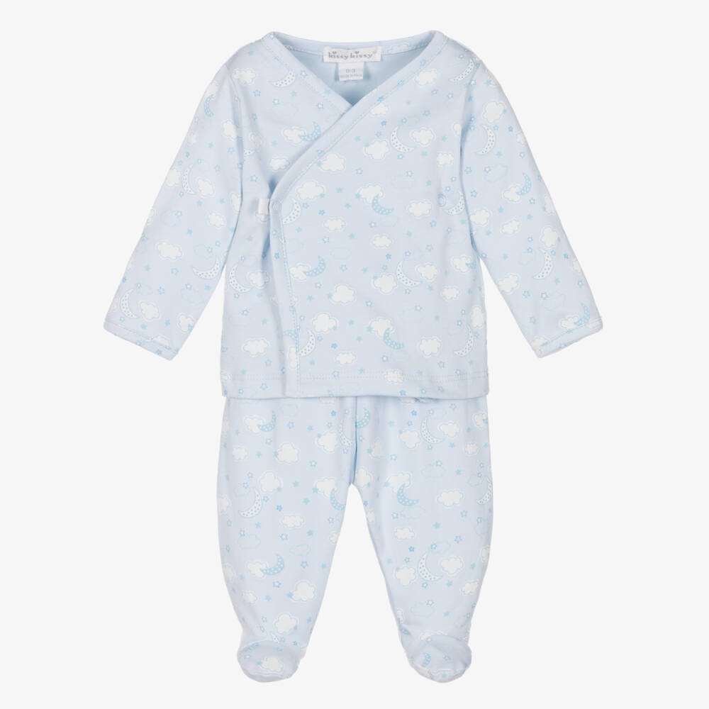 Lovely pale blue two-piece babygrow for boys by Kissy Kissy, made in super soft and stretchy Pima cotton jersey. Kind and gentle against delicate skin, it has a pretty blue cloud and moon print. The cross-over front top secures with poppers for quick and easy dressing. Smaller sizes have useful fold-over scratch mitts. The matching trousers have a gently elasticated waist for a good fit.
