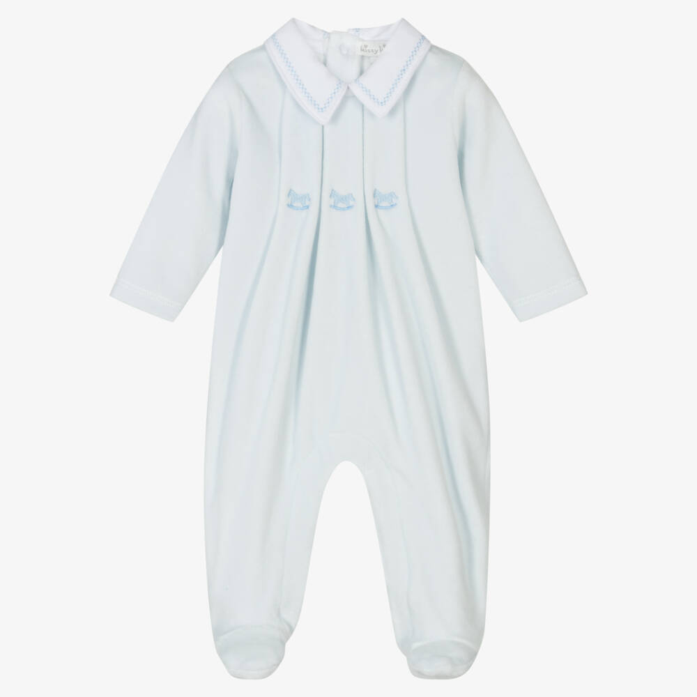 Lovely blue babygrow for boys by Kissy Kissy, made from soft and comfortable cotton velour. It has a white pointed collar for a smart touch and is embroidered with classic rocking horses across the chest for a playful finish. There are gentle pleats on the front and easy popper fastenings on the back and between the legs.