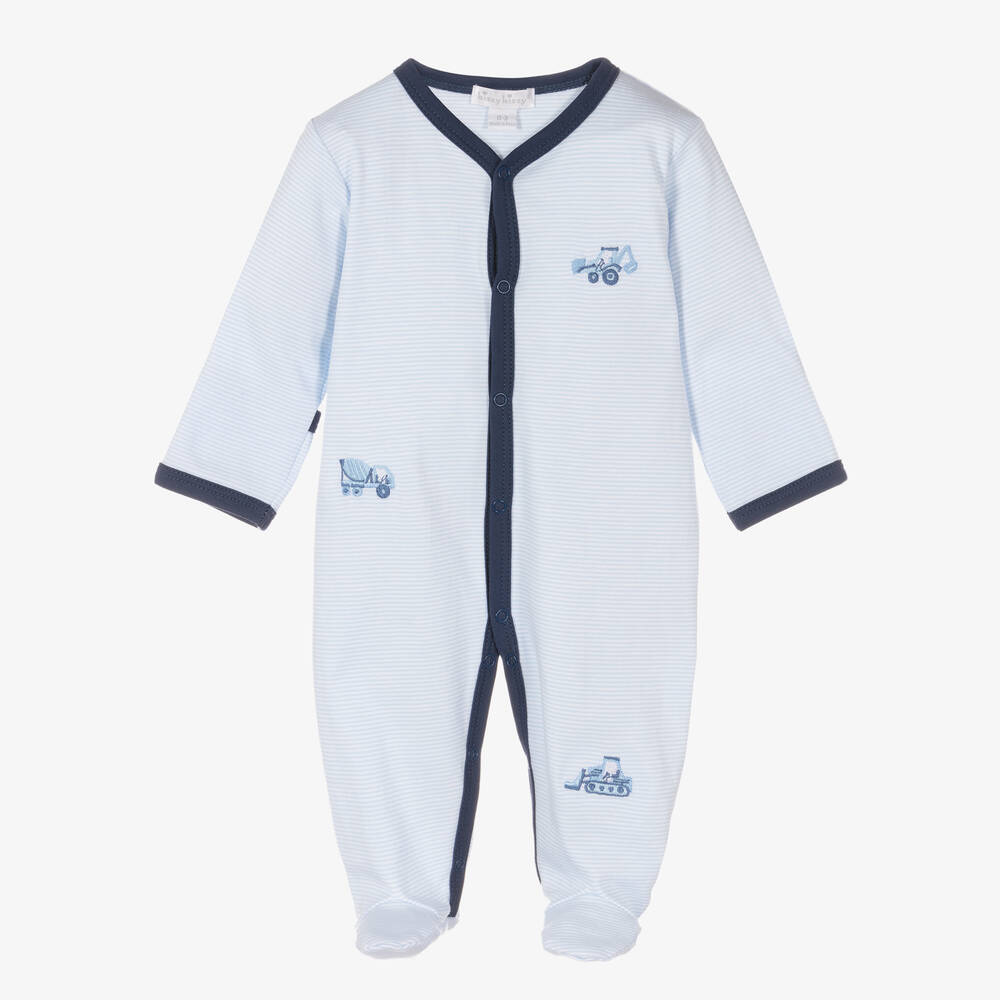 Fine blue and white striped Pima cotton babygrow for boys by Kissy Kissy, with navy blue trims. Delightfully soft against delicate skin, it has cute construction vehicles embroidered on the front and easy popper fastenings. Smaller sizes have fold-over mittens on the cuffs.