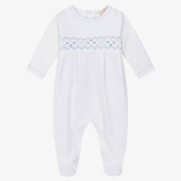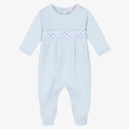 Pale blue babygrow for boys by Kissy Kissy featuring a charming white hand-smocked panel across the chest with delicate embroidered flowers. Made in soft Pima cotton, it has popper fastenings on the back and between the legs to help with dressing.