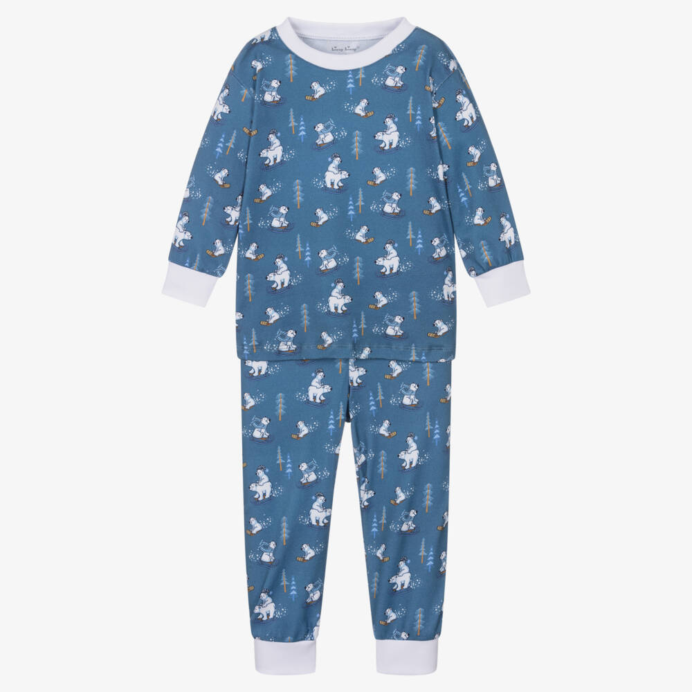 Fun blue pyjamas for boys by Kissy Kissy, with a sledging polar bears pattern. Just right for a good night's sleep, they are made in super soft Pima cotton jersey with cosy white ribbed trims. The waistband is gently elasticated for comfort.