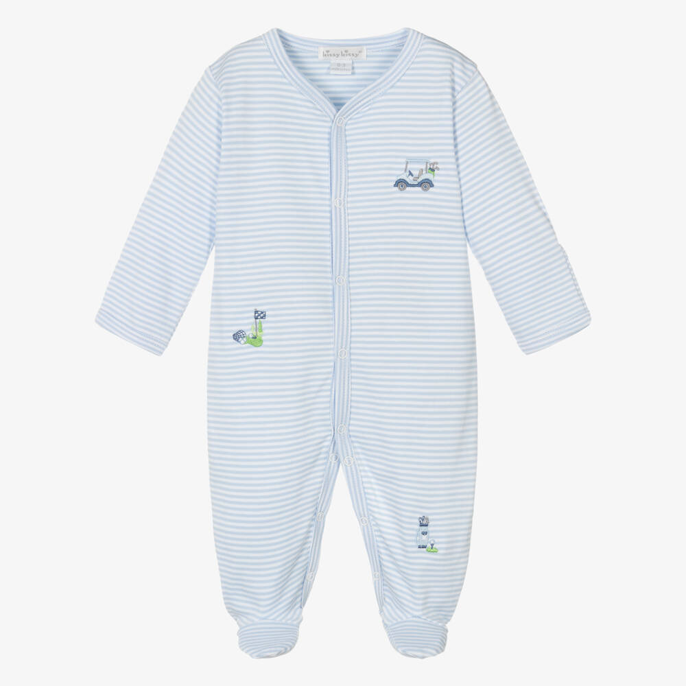 Designed by Kissy Kissy, this pale blue and white striped babygrow for boys is made from soft Pima cotton jersey. Cute and charming, it has blue and green golf-inspired designs embroidered on the front. There are popper fastenings down the centre and between the legs for easy dressing, and fold-over scratch mitts on smaller sizes.