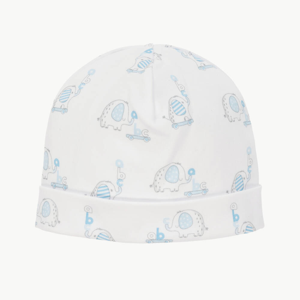 White hat for baby boys by Kissy Kissy, made in a double layer of super soft and stretchy Pima cotton jersey. It has a playful blue and grey elephant print and a cute turned-up brim.