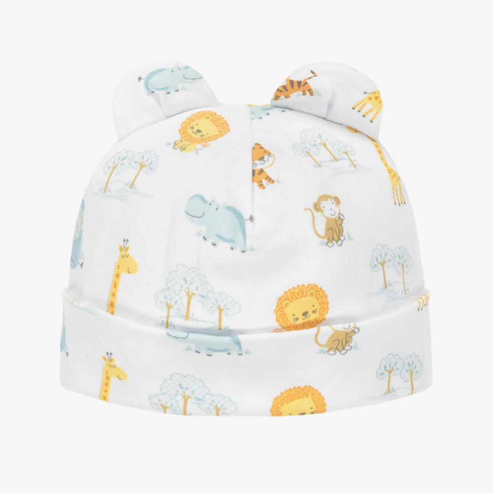 White hat for baby boys by Kissy Kissy, made in a double layer of super soft and stretchy Pima cotton jersey. It has an all-over colourful safari animal print, with a turned-up brim and super cute 3D ears on the top.