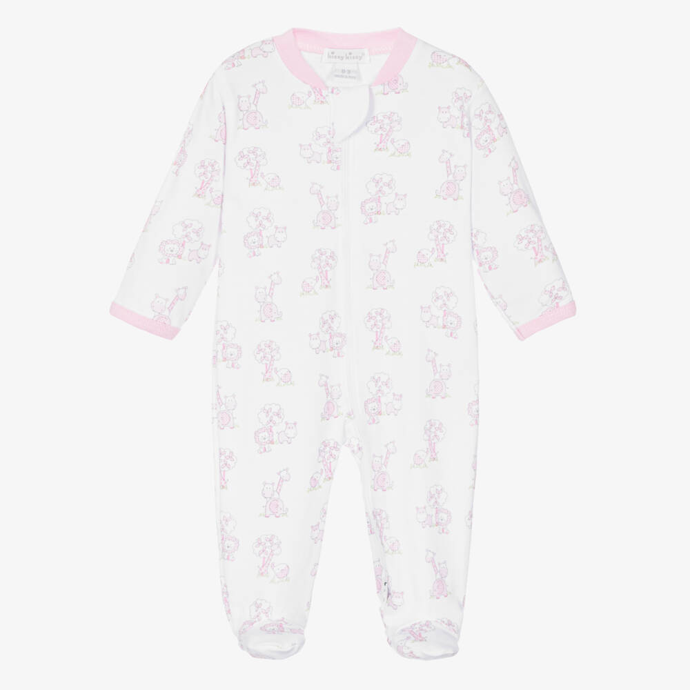 White babygrow for girls by Kissy Kissy, made in super soft Pima cotton jersey. It has a sweet jungle animal print in pink, with pink ribbed trims. To protect baby's delicate skin, the long zip fastening has a chin guard at the top, and there are fold-over scratch mitts on the smaller sizes.