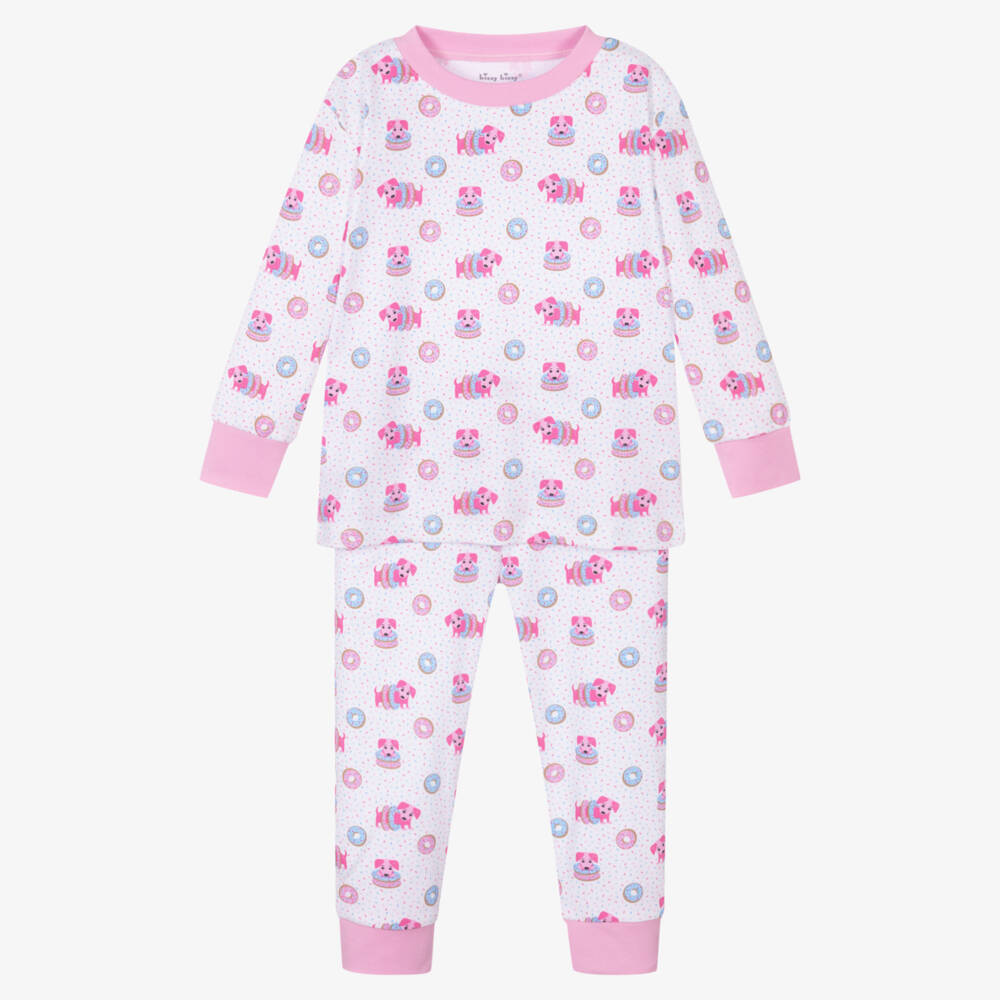 A pair of white and pink long pyjamas for girls by Kissy Kissy, made in soft and strechy Pima cotton jersey. In shades of pink and blue, the fun print features doughnut motifs and cute puppies on a sprinkles background. Both pieces have cosy ribbed trims and the bottoms have an elasticated waist for a comfortable night's sleep.