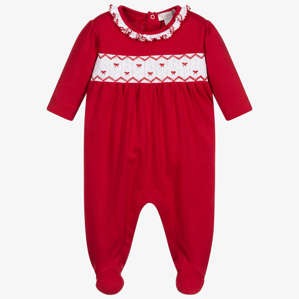 Lovely red festive babygrow for baby girls, by Kissy Kissy. Made from beautifully soft Pima cotton, it has beautiful white and red hand-smocking on the front with a sweet white ruffle neckline. It fastens with poppers on the back and between the legs for easy dressing.