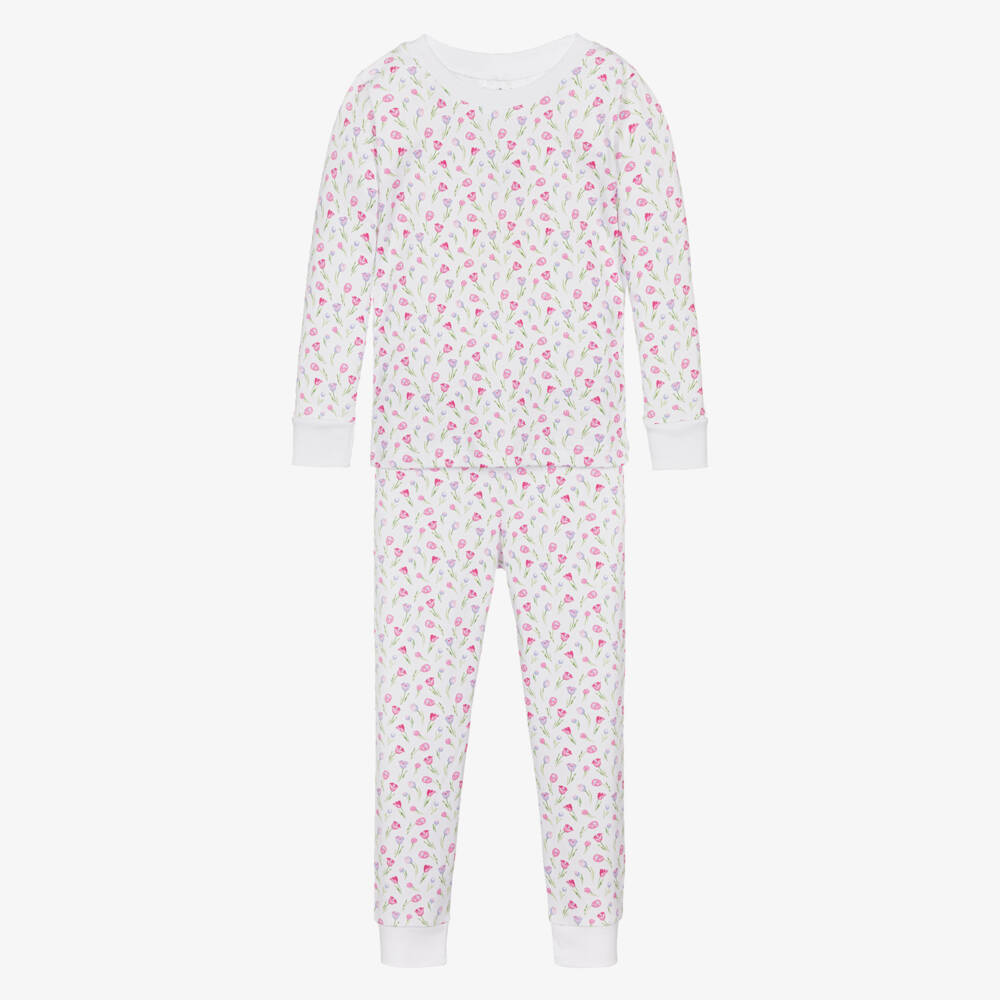 Lovely white pyjamas for girls by Kissy Kissy, with a pretty tulip print in pink and purple. Super comfortable to wear, they are made in beautifully soft Pima cotton jersey with gently ribbed trims.
