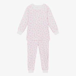 Pink long pyjamas for girls by Kissy Kissy, made in super soft and stretchy Pima cotton jersey. They have a cute pattern of penguins and polar bears fishing and playing on icebergs. They have cosy ribbed trims and the bottoms have a comfortable elasticated waistband.