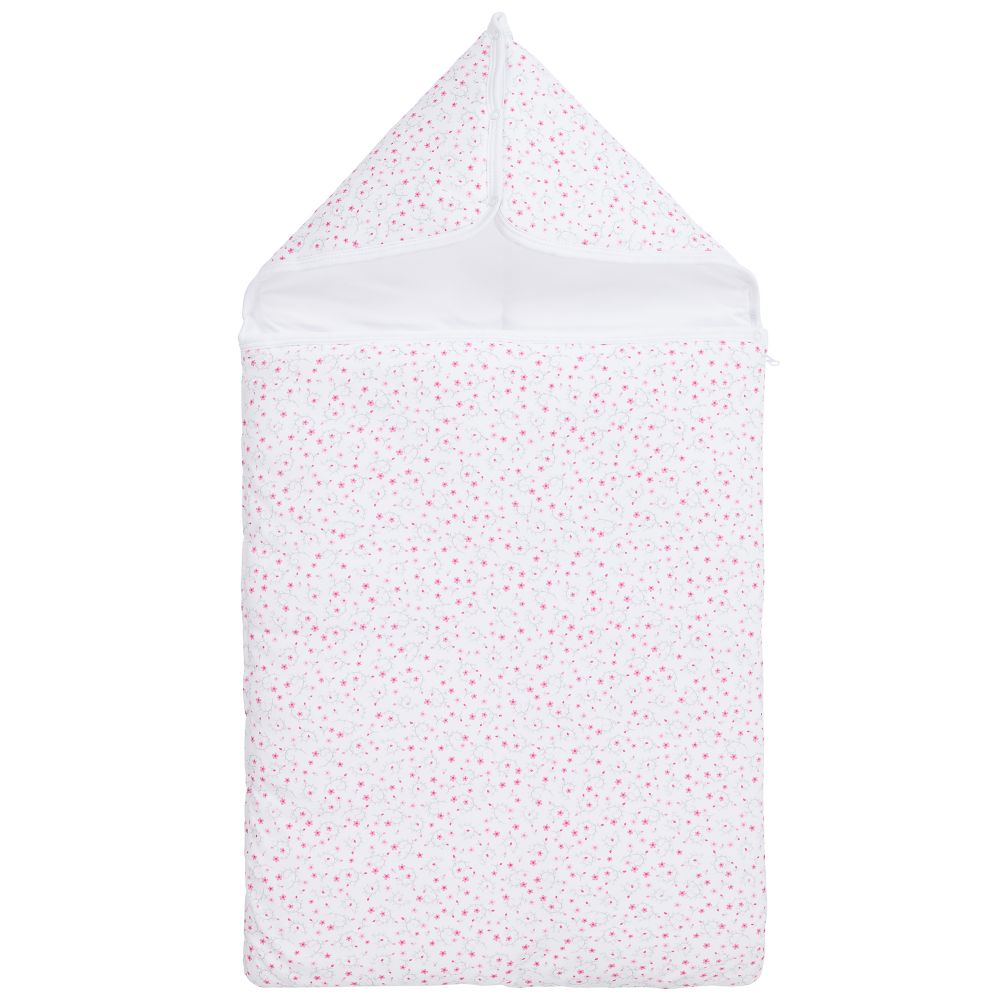 Pretty nest for baby girls by Kissy Kissy, with a pink floral pattern on a white background. Lightly padded, it is made in soft Pima cotton jersey. The hood can be opened out as baby grows.