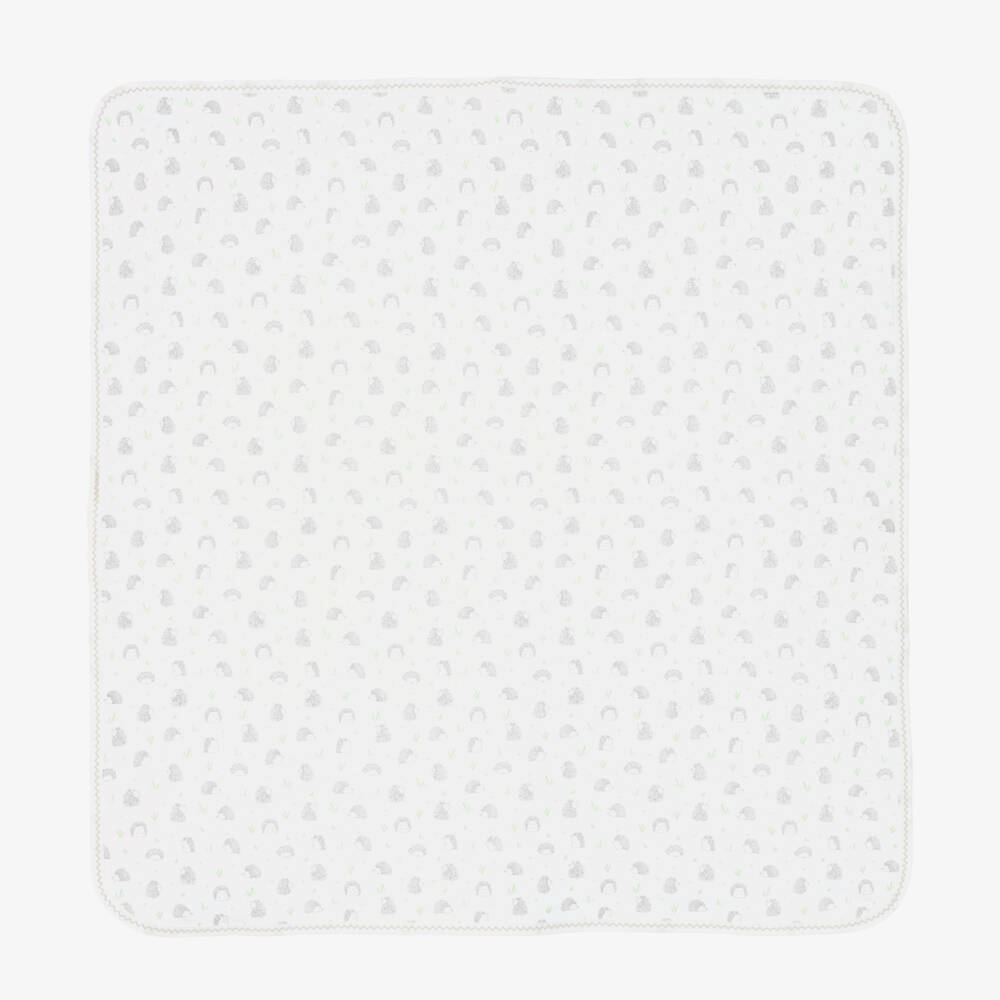 White blanket for baby boys and girls by Kissy Kissy, made in a double layer of super soft Pima cotton jersey. With an adorable grey hedgehog print, it is plain on the reverse and has a sweet grey stitched trim. A versatile nursery accessory, it can be used to wrap around baby or when out and about in the pram or car seat.