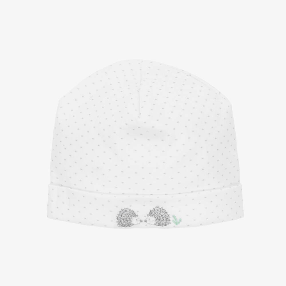 Sweet white layette hat for baby boys and girls by Kissy Kissy, patterned with delicate grey polka dots. Beautifully soft against babies delicate skin, it easily slips on over your little one's head and has a cute embroidered hedgehog on the turned-up brim.