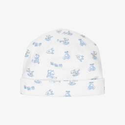 Baby boys white super soft Pima cotton hat by Kissy Kissy. Made with a double layer of jersey, it has a Noah's Ark print and a sweet, blue scalloped trimmed brim.