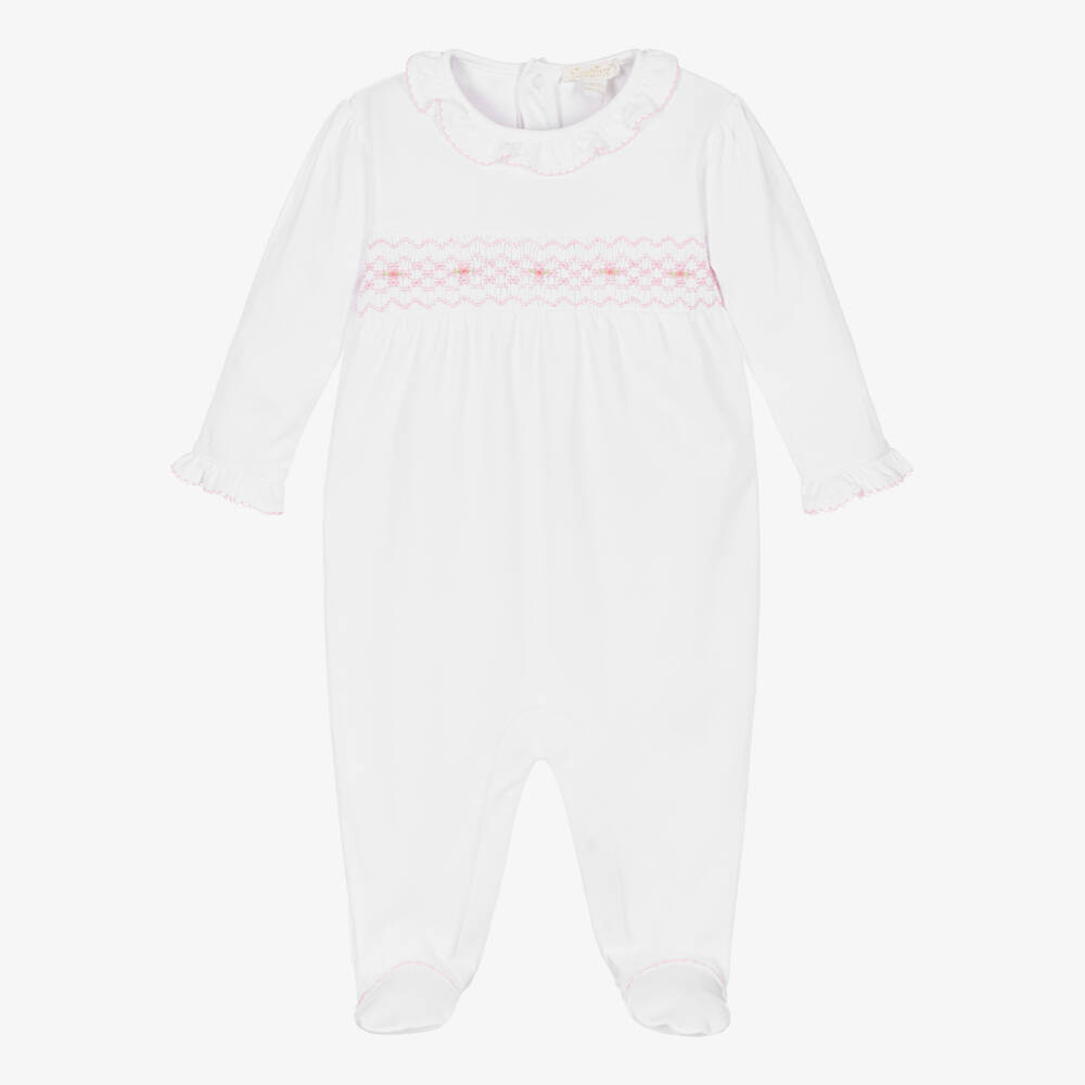 Adorable white babygrow for little girls by Kissy Kissy, made from beautifully soft Pima cotton jersey. Kind and gentle against baby's delicate skin, it has a delicately hand-smocked and embroidered panel across the front with pretty pink detailing. Ruffle trims with pink picot edging on the collar and cuffs complete this cute look. It fastens with poppers on the back and between the legs for quick and easy dressing.