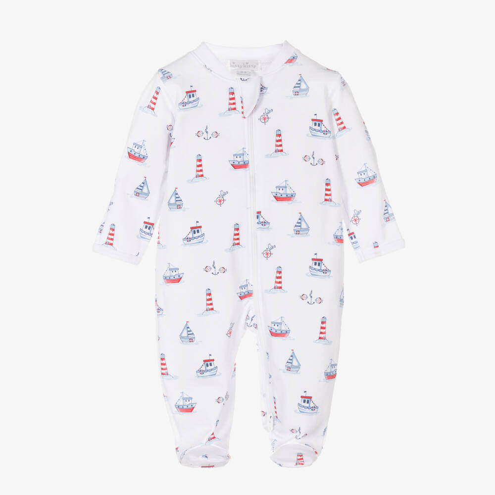 Cute white Pima cotton babygrow for boys and girls by Kissy Kissy, with a red and blue sailboat and lighthouse print. Made in super soft, comfortable jersey, it has an easy-to-use zip fastening on the front with a protective chin guard and useful fold-over scratch mitts.